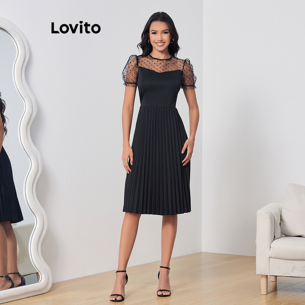 Lovito Vestido Casual Liso Com Renda Dividida E Estrutura Dividida Para Mulheres LBE03149 (Preto)