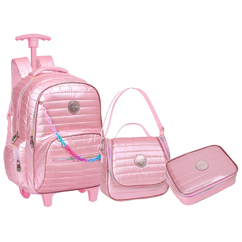 Kit Mochila de Carrinho Escolar Lancheira Estojo Box Juvenil Teen Metalizada Rosa Matelasse Faculdade Feminina