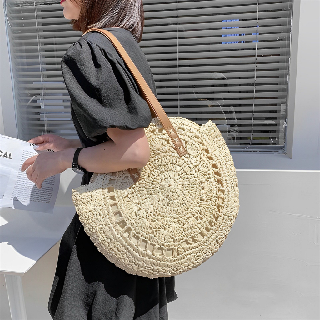 Juzia Bolsas Bolsa palha de praia redonda desenho bolsa tote de ombro alça de couro sintético fecho de zíper