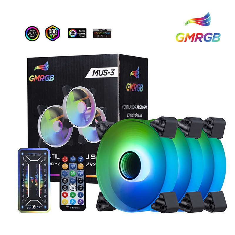 GMRGB Kit 3 Coolers Ventoinha de 120 mm para caixa de computador RGB 6PIN Para PC Gabinete 120mm Led ARGB Aura Sync 38CFM Com Controladora e Controle Remoto