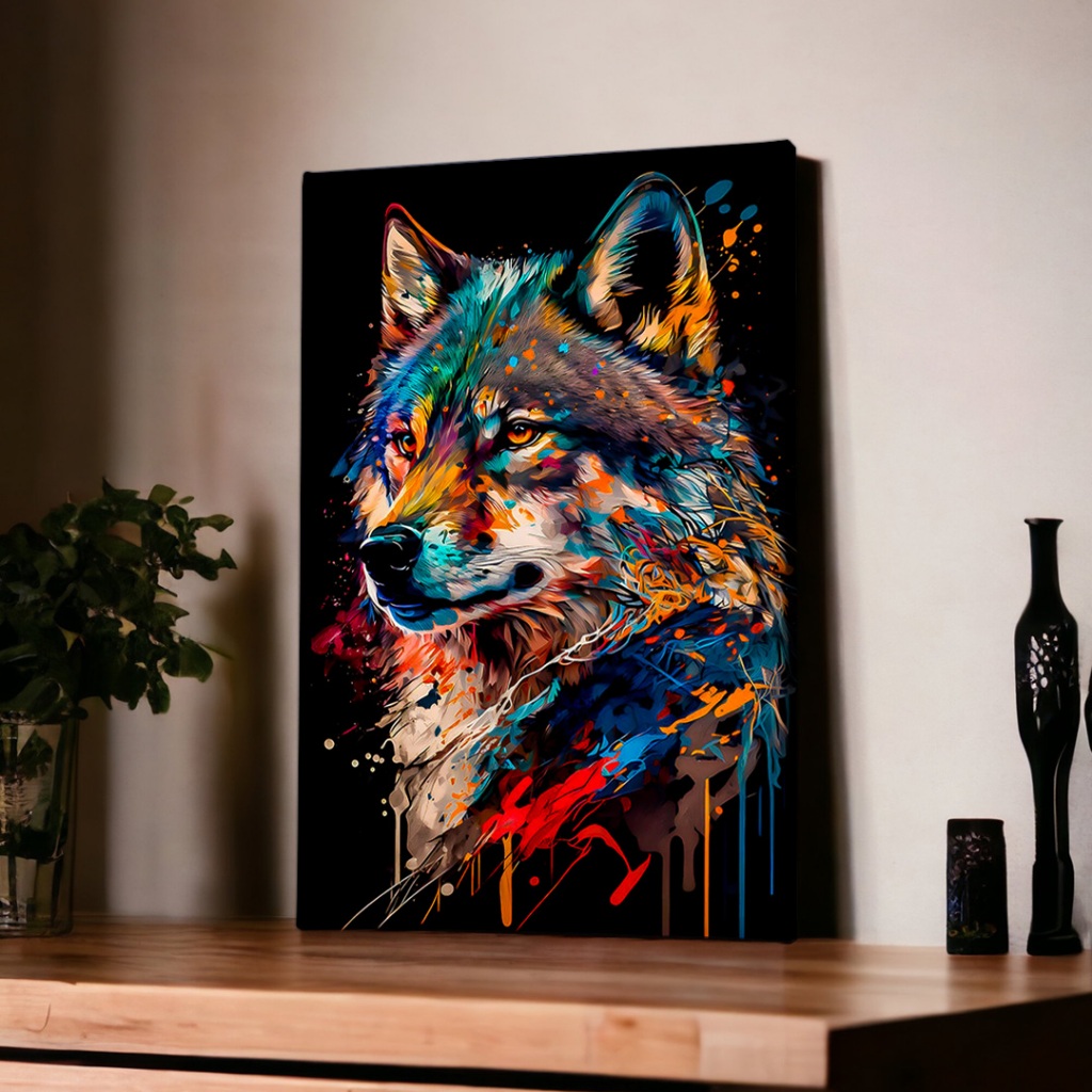 QUADRO DECORATIVO DE PAREDE LOBO ART GRAFITE COLORIDO FUNDO PRETO - CANVAS BORDA INFINITA 40X60cm