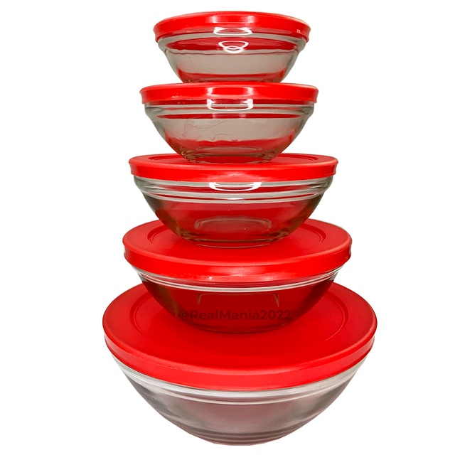 Conjunto 5 Potes Tigelas Vasilhas de Vidro Com Tampa Vermelha ou Preta