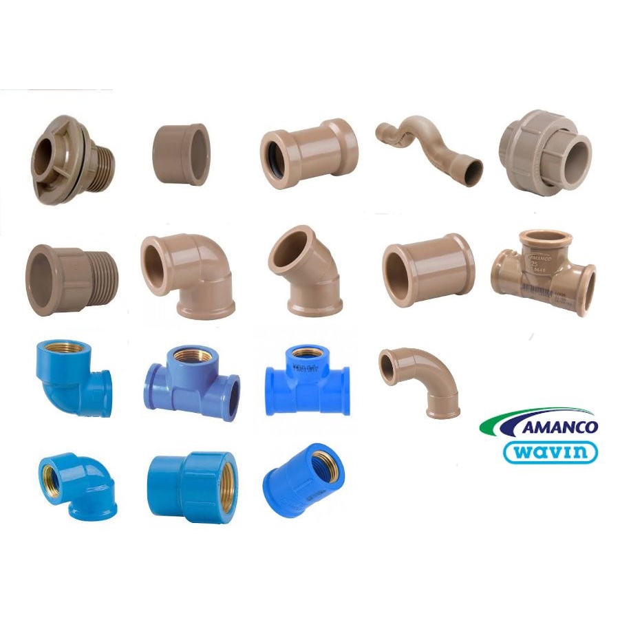 Amanco Wavin Kit Conexões de Água 3/4 ( MARROM / AZUL ) 25mm- Cotovelo - Luva - Tee - Curva 45 - Caps - Luva LR - Adaptador - Curva Longa - Flange - União
