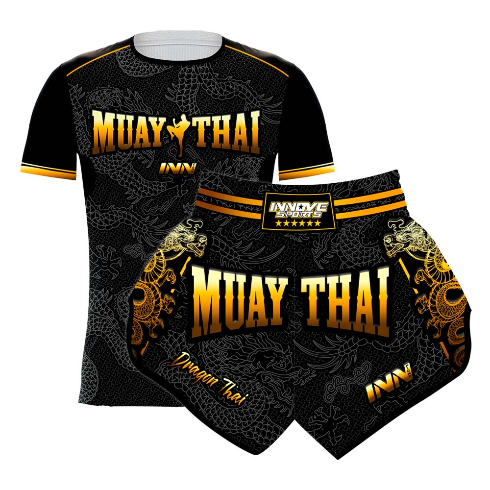 Conjunto Muay Thai Masculino Camiseta e Short Dragon Thai Dourado