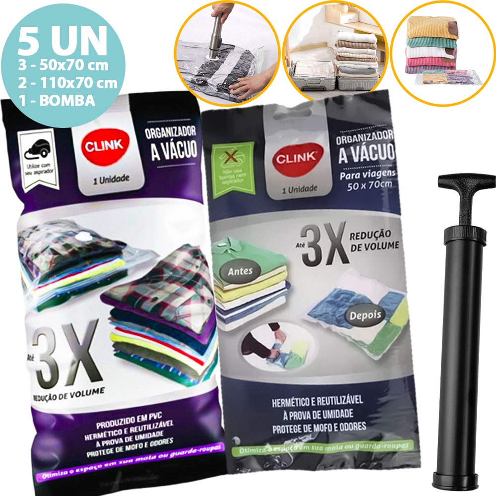 Kit Saco a Vácuo 5x - 3 Saco 50x70 e 2 Saco 110x70 Organizador Guarda Roupa Plástico Malas Sacos Vacuo c/Bombinha de Ar Organização Protetor