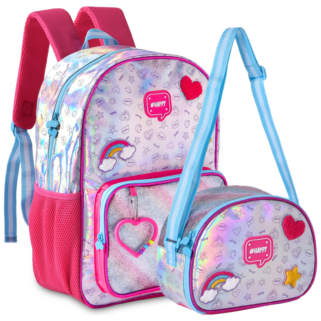 Kit Mochila de Costas Holográfica Infantil Escolar Lancheira Térmica Clio