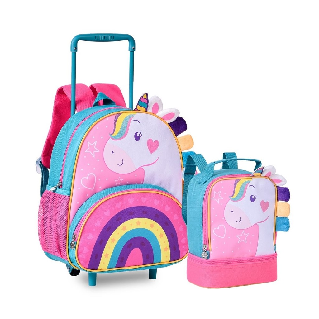 Kit Mochila de Rodinhas C/ Lancheira Térmica - Unicórnio - Infantil Pets Escolar Creche - Clio
