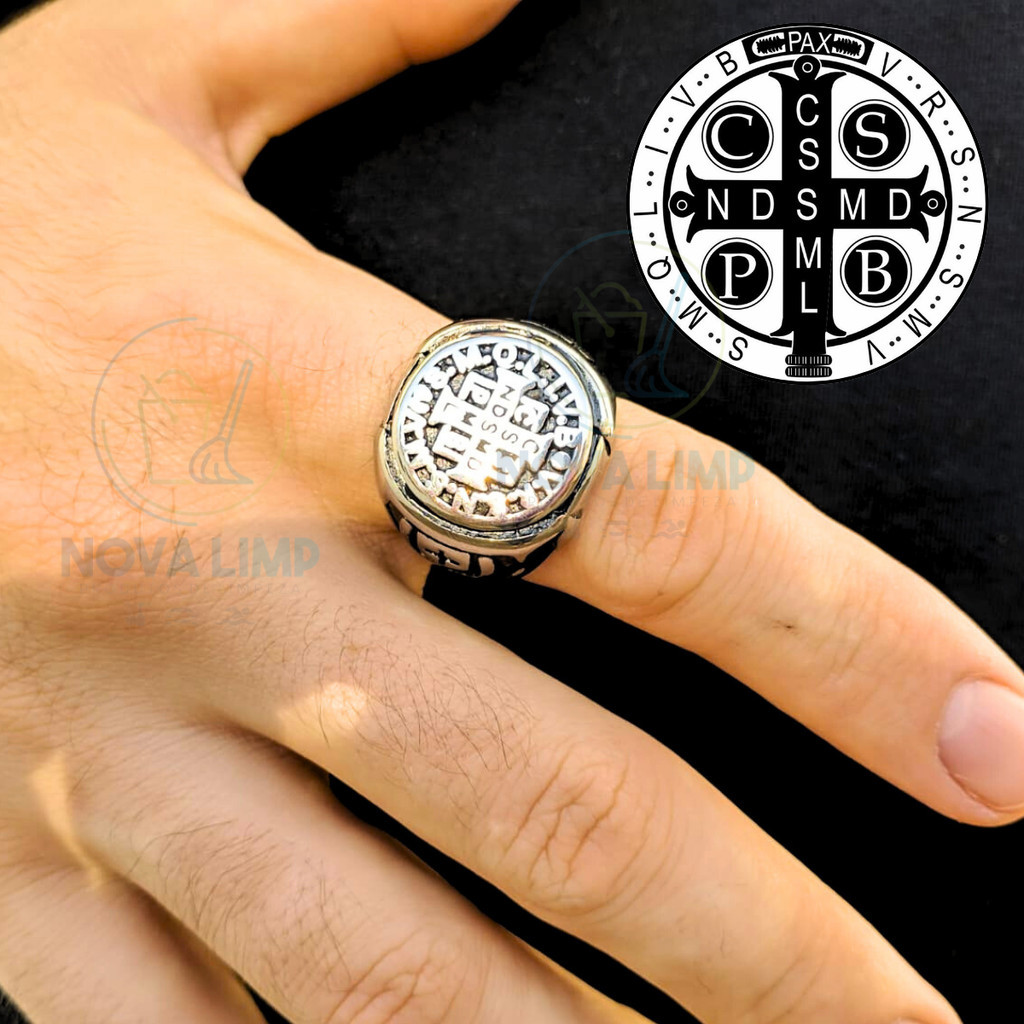 Anel de São Bento Banho de Prata 925 Anel Masculino Banhado Anel Cravejado Dedeira