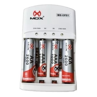 Carregador De Pilha AA x AAA e Bateria 9V Mox Com 4 Pilhas Aa 2600mah Recarregável