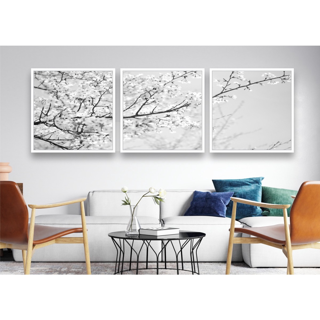 Kit com 03 Quadros Decorativos Ramos Paisagem Cerejeira Monocromático com moldura Branca ou Preta