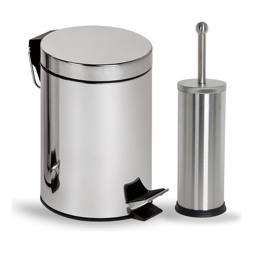 Kit Banheiro Lixeira Inox Com Pedal E Tampa 5 Litros 5L + Escova Sanitária Em Aço Inox Para Limpeza Higienização De Vaso