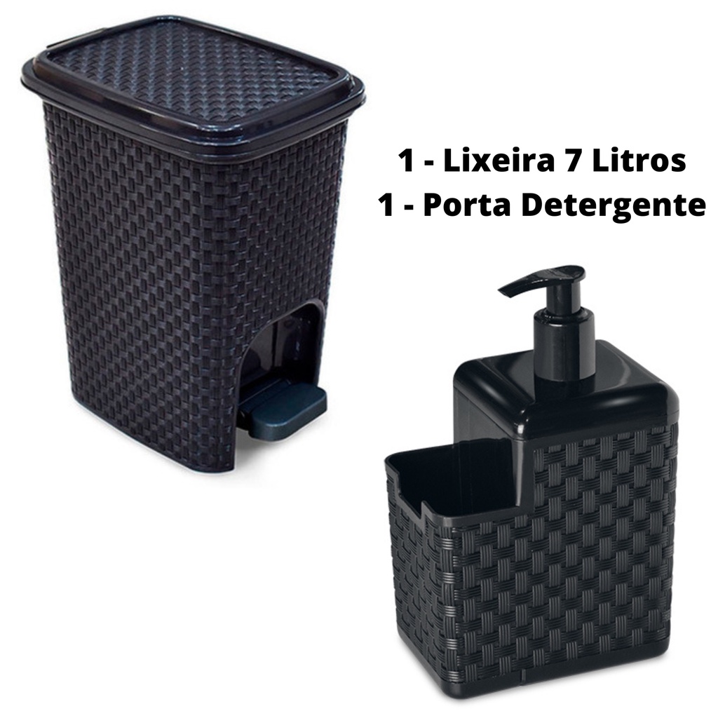 Kit Lixeira Com Pedal 7 Litros + Porta Detergente e Esponja Dispenser Litros Com Tampa Preto Rattan Casa Escritório Banheiro Cozinha Resistente