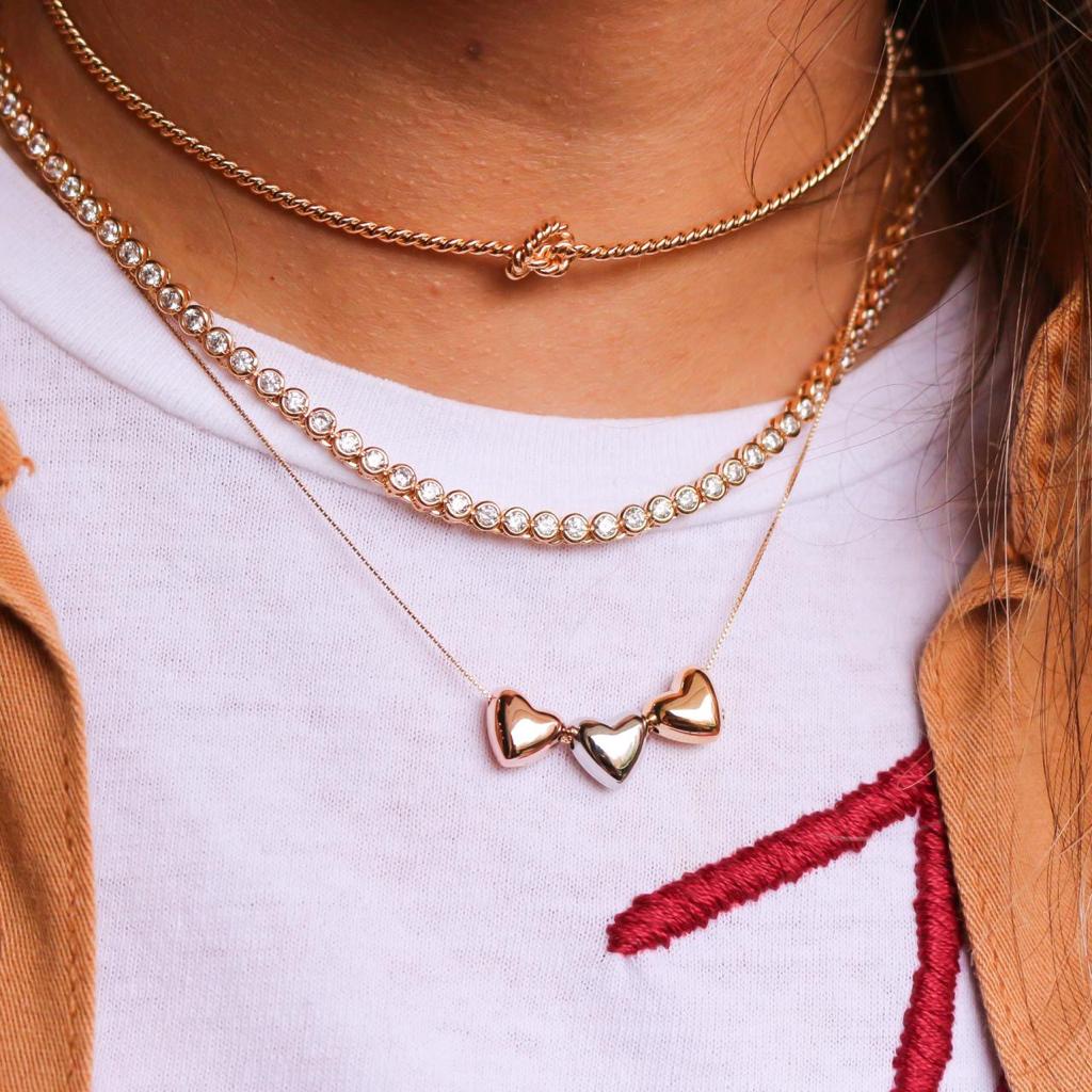 Colar Feminino Amoeto Trio de Corações Semijoia Banhado Ouro E Ródio