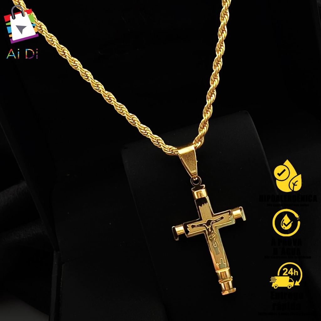 Colar de Corrente Fina com Pingente de Cruz de Jesus Cristo - Cordão Banhado a Ouro 18K Não Escurece