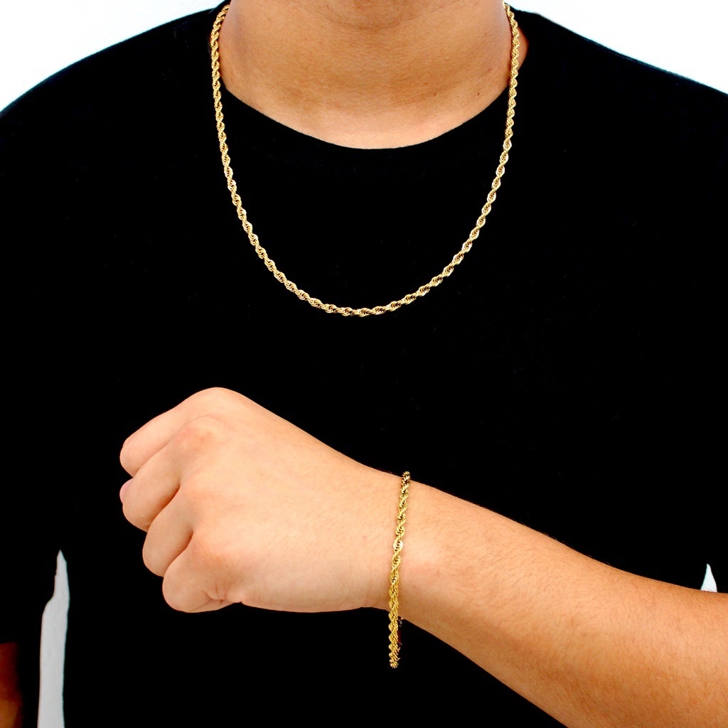 Cordão corrente colar E Pulseira Masculino Baiano 4mm Aço Banhado A Ouro