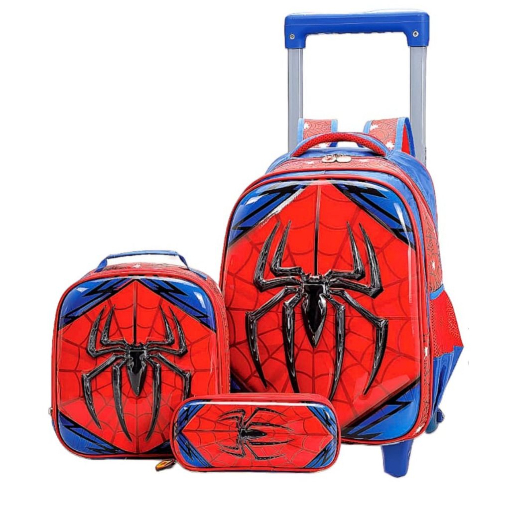 Kit 3 Mochila De Carrinho Spiderman Espaçosa Alça Retrátil Acompanha Estojo E Lancheira Térmica Volta As Aulas
