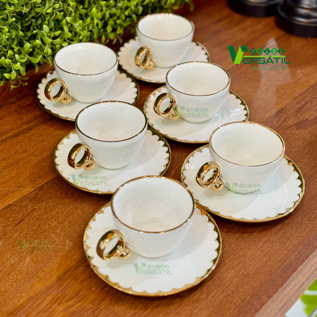 Jogo 6 Xícaras Wolff 200ml Porcelana Chá Grande Egg Dubai Gold Ouro Cantinho Grande com Píres e Alça Conjunto Kit