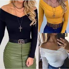 Blusa canelada Ombro a Ombro manga longa moda blogueira