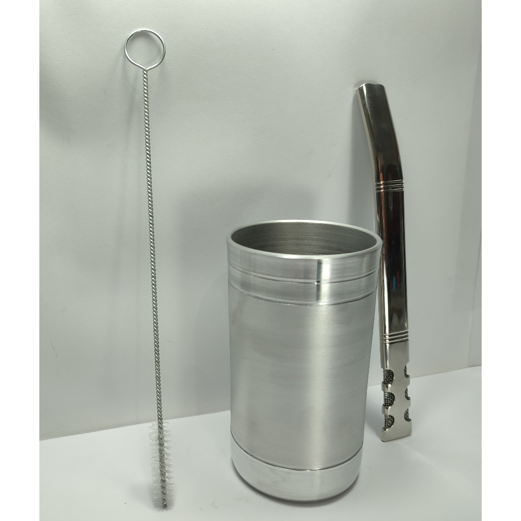 Kit para Tereré: Copo Cuia Redonda De Alumínio Jateado 2MM 300ml + Bomba INOX V6 PREMIUM TELADA POLIDA e Escovinha Limpeza