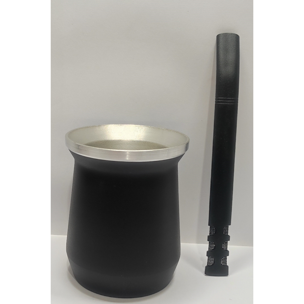 Kit Tereré 1 Copo Cuia De Alumínio Preto Fosco 300ML 1 Bomba De Inox Preta Com Mola Cônica