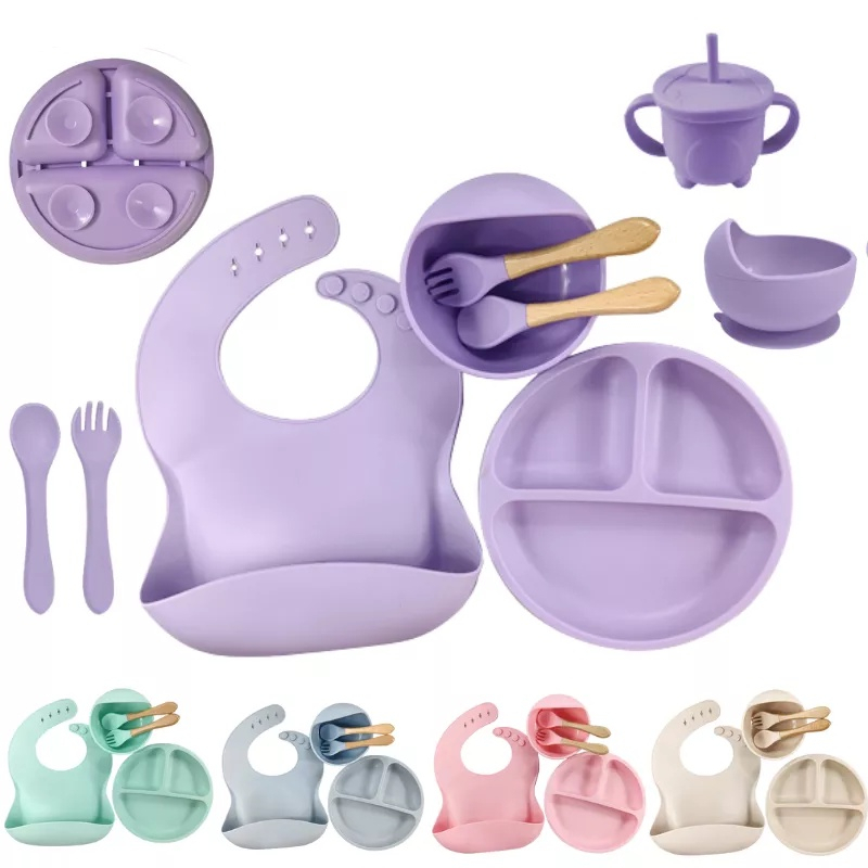 Kit 6/8 pecas Talheres do Bebê Conjunto Prato De Jantar De Silicone Para Bebês Com Tigela De ventosa Sippy Cup Bibs Colher
