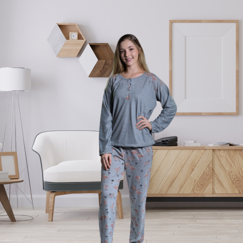 Pijama De Malha Mescla Feminino Inverno Longo com abertura e botão
