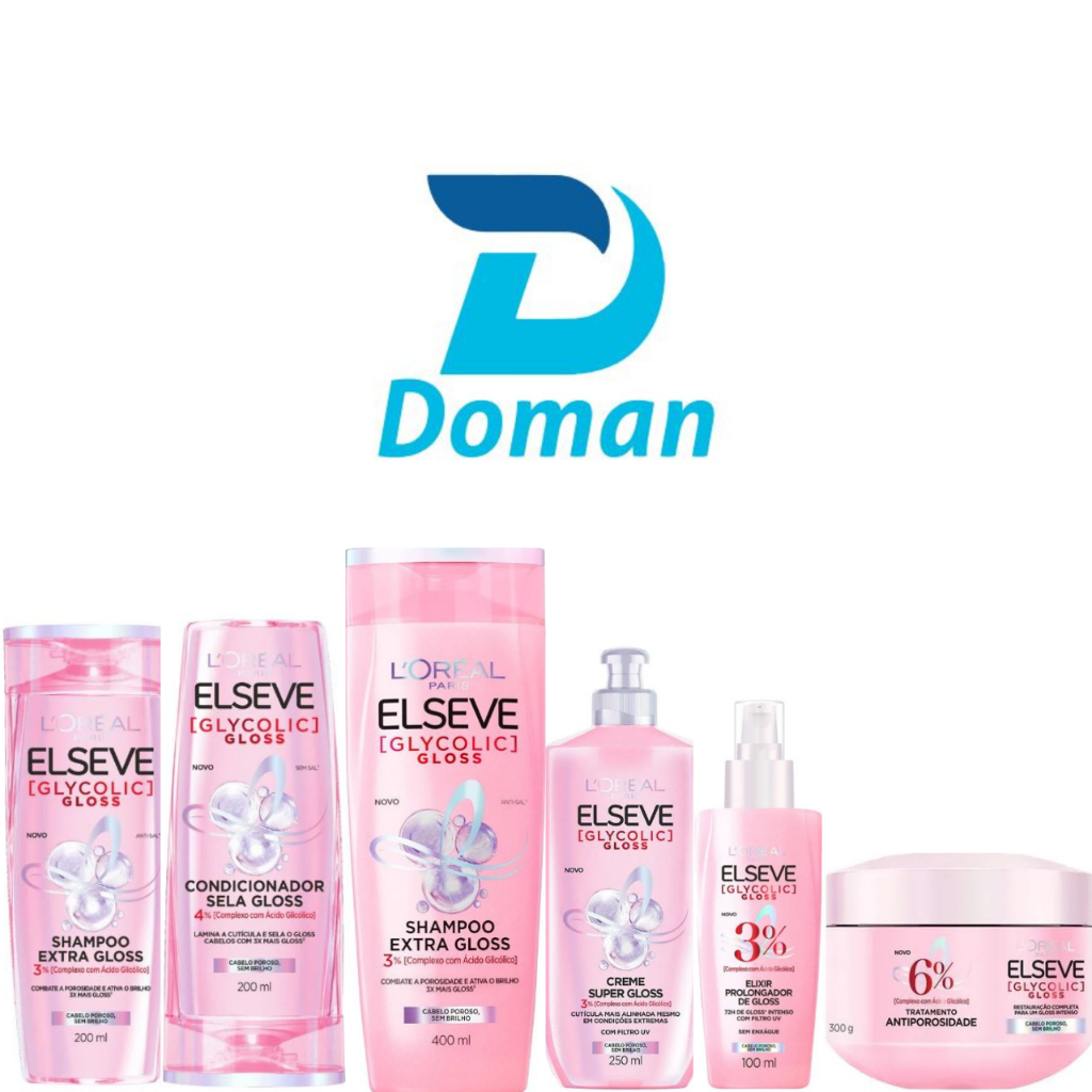 Kit Elseve Loreal Glycolic Gloss Shampoo 200ml + Condicionador 200ml + Máscara 300g + Creme Super 250ml + Óleo Elixir 100ml