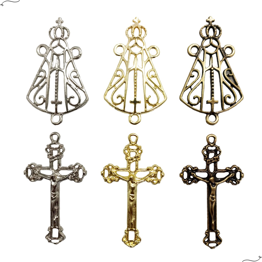 50 Crucifixos 50 Entremeios Nossa Senhora Aparecida Ouro Velho Prata e Dourado Para Terço