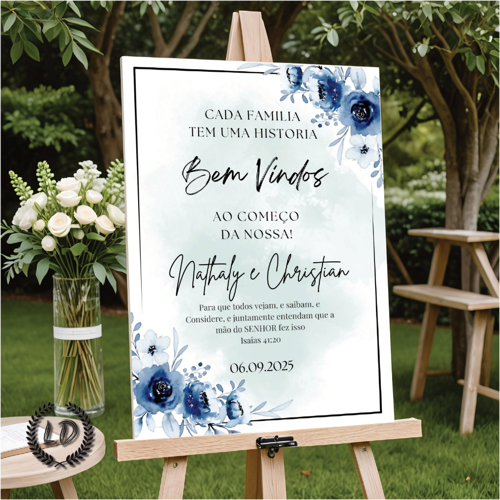 Placa Decorativa Recepção de Casamento Bem-vindos Flores Azuis Iniciais do Casal Personalizado