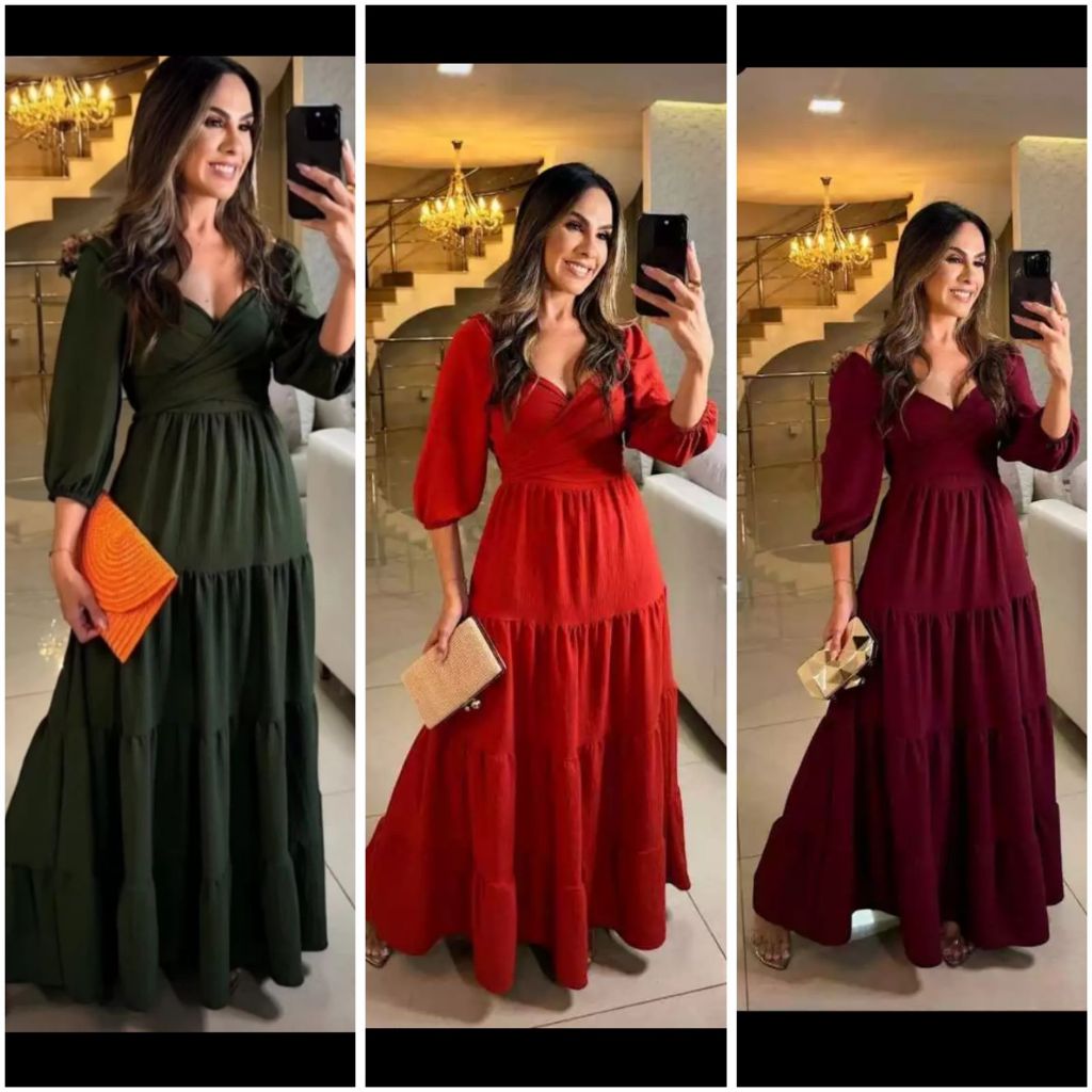 Liny Style Vestido Longo Feminino 3 Marias Decote V Manga Curta E Elástico Na Cintura Modelo Festa