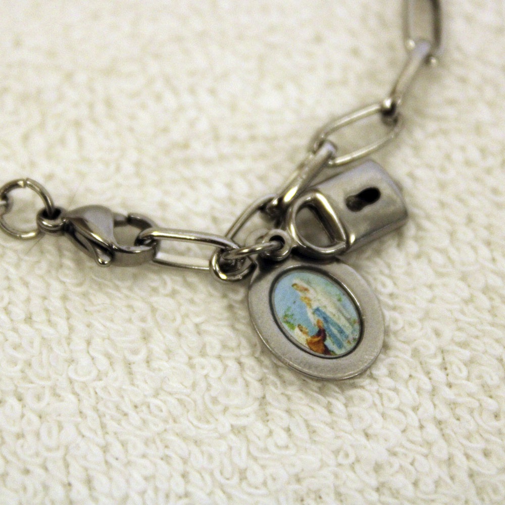 Pulseira Cadeia da Consagração Com Medalha de Nossa Senhora de Lourdes Inox