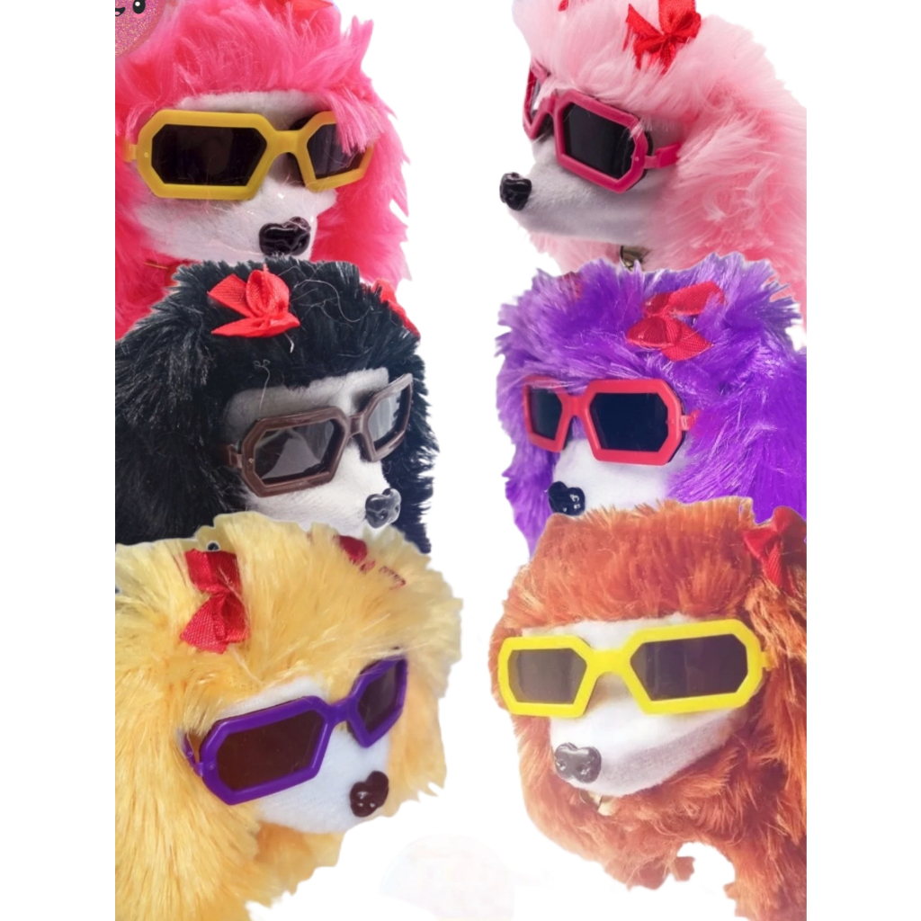 Cachorrinho de pelucia anda e late sozinho e acende os olhos orelhas longas óculos e laços.