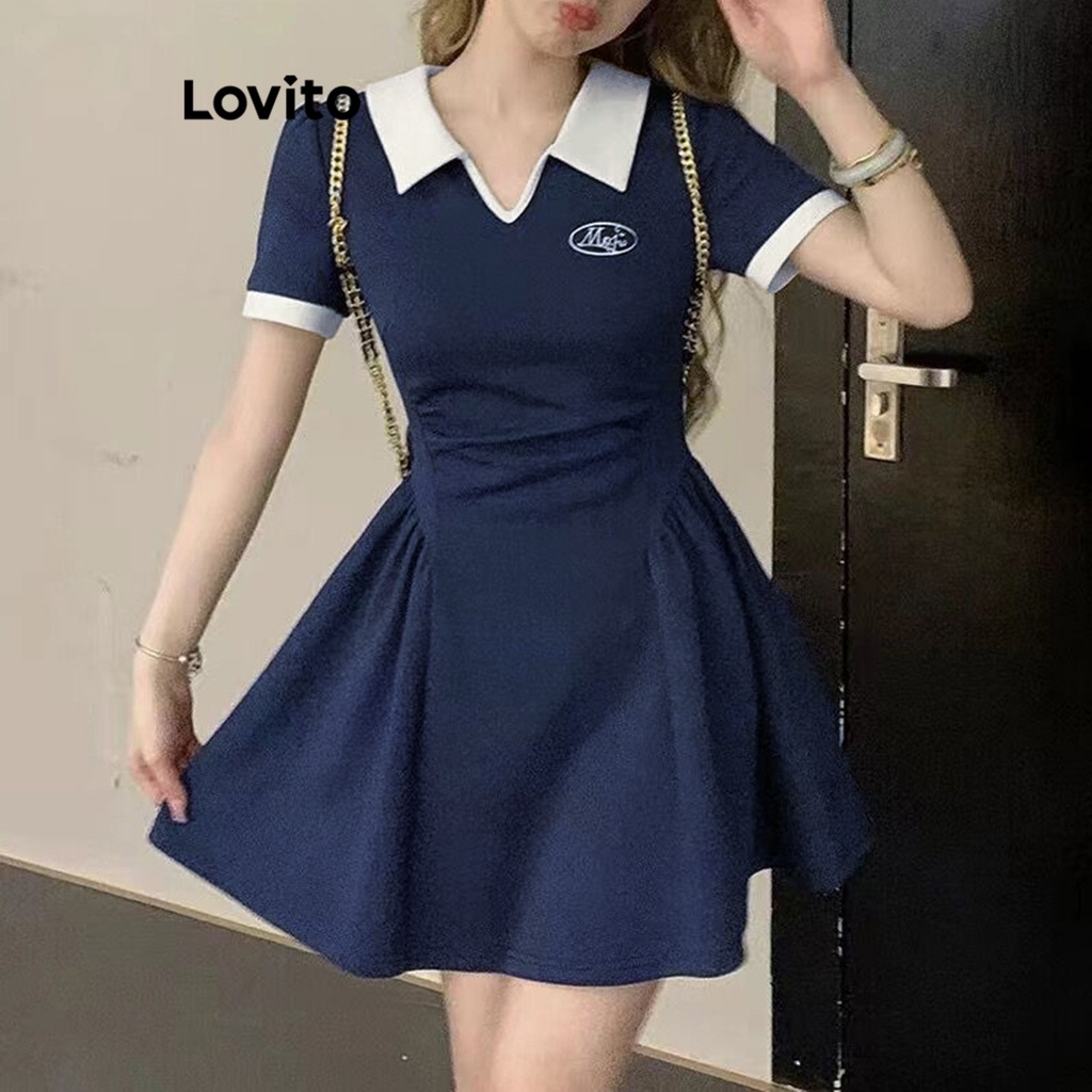 Lovito Vestido Simples com Blocos de Cores e Amarração para Mulheres LNE17116 (Azul Marinho)