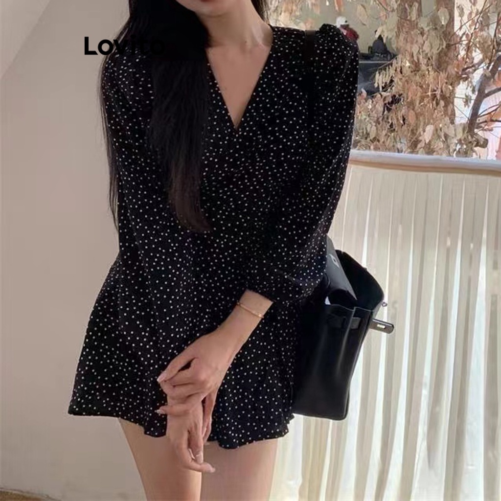 Lovito Vestido com Amarração de Bolinhas para Mulheres LNE19109 (Preto)