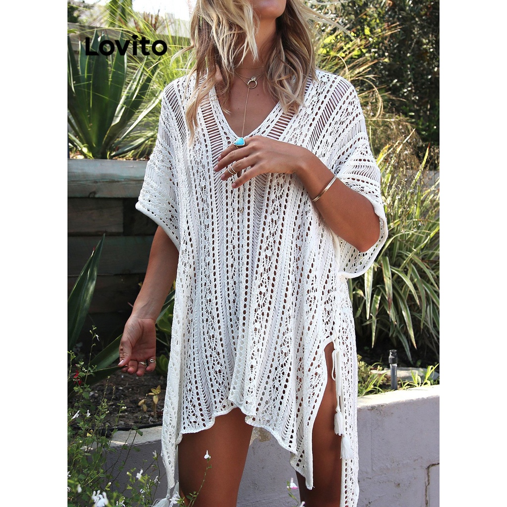 Lovito Vestido Saída de Praia em Crochê e Renda Lisa para Mulheres LNE31069 (Branco)