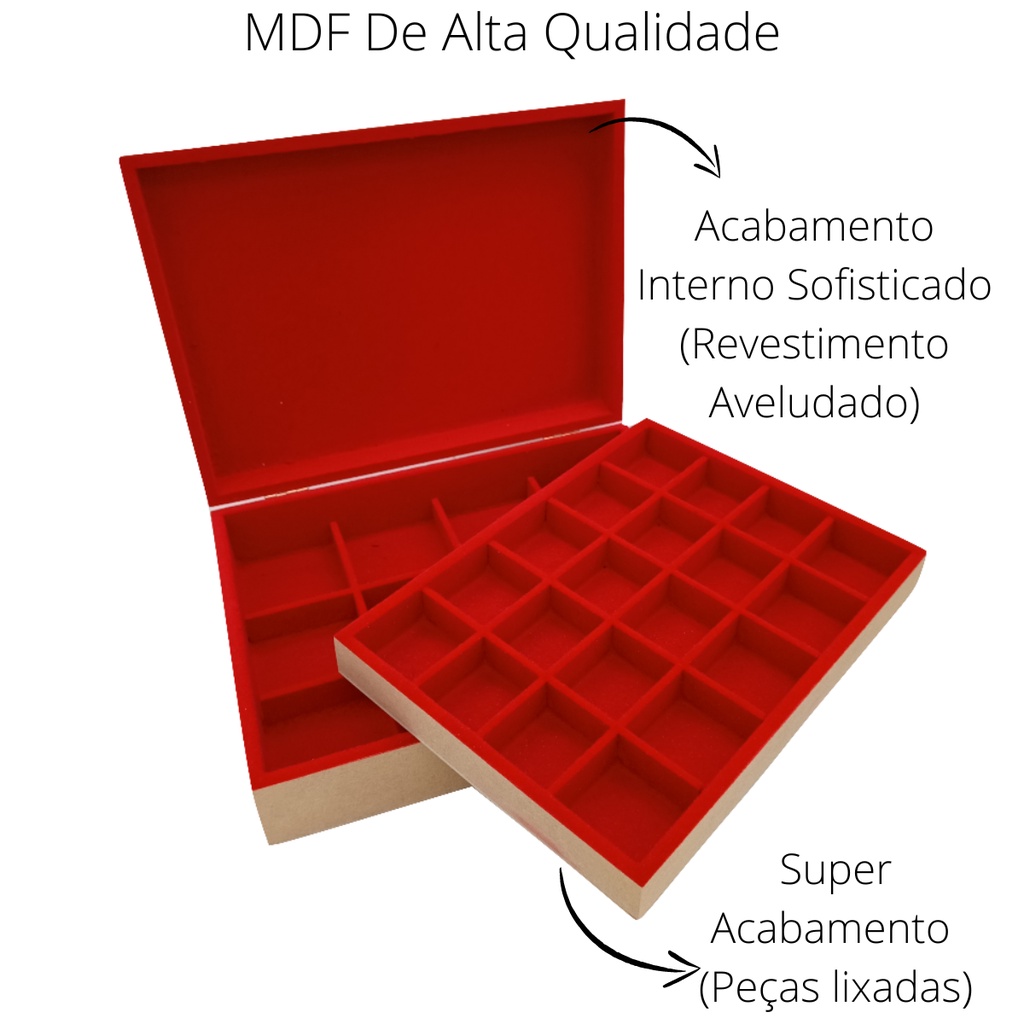 Caixa Flocada Com Dobradiça E 15 Divisórias 35x25x7 Especiarias Porta Biju - MDF Madeira