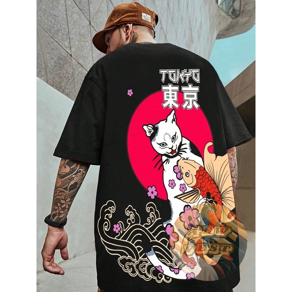 Camiseta Masculina Gato Carpa Japones Unissex Algodão Streetwear Premium Plus Size - Envio Imediato