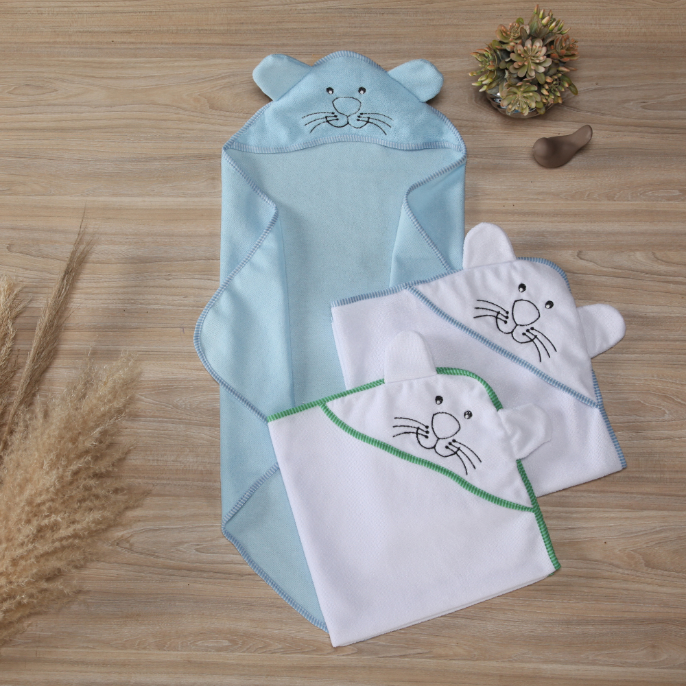 Toalha de Banho Bebe Kit 3 Toalhas Bordada com Capuz Forrado em Tecido Fralda 100% Algodão