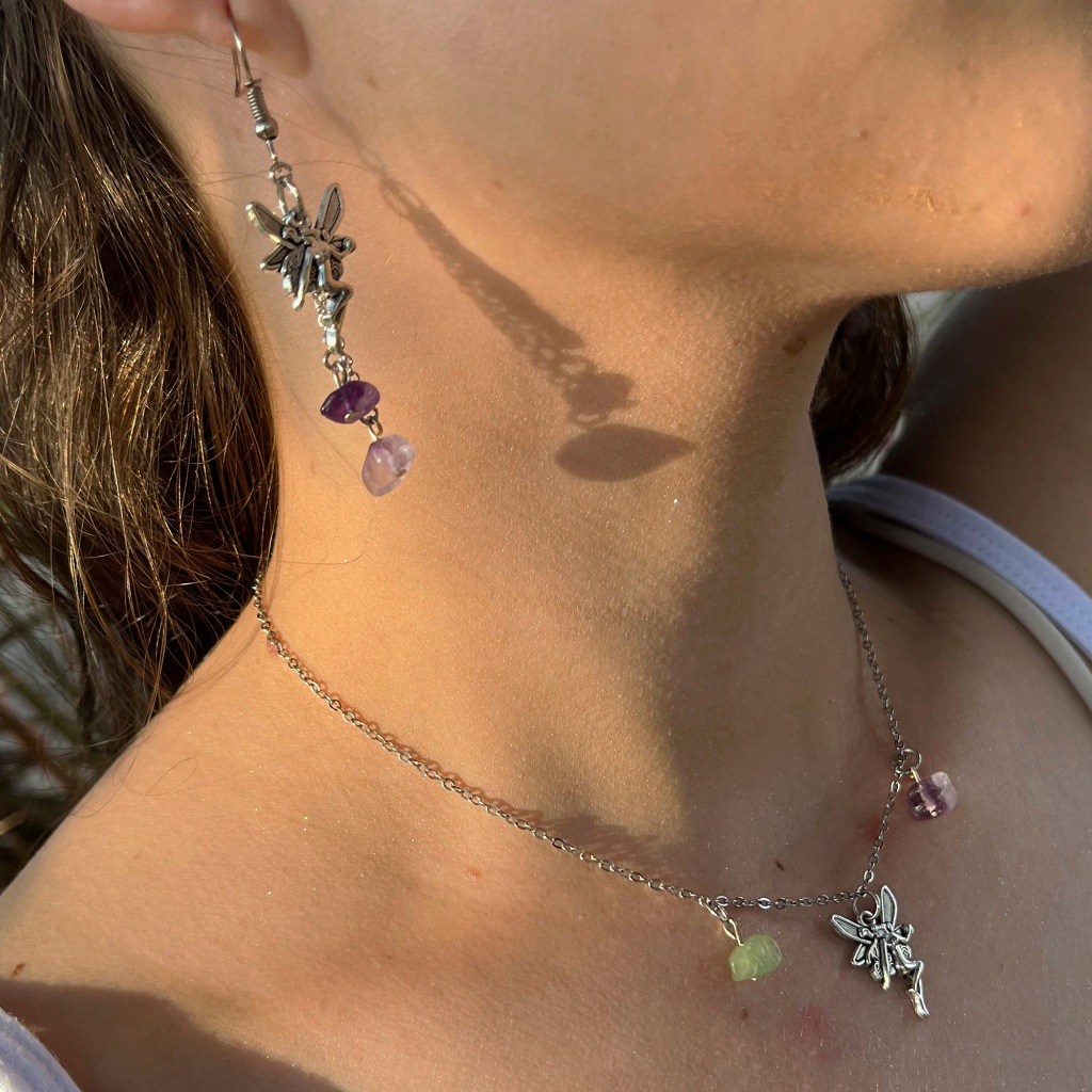 Colar em Aço Inoxidável Fada com Pedra Natural FairyCore/Cottagecore/Aesthetic Brincos Pedra