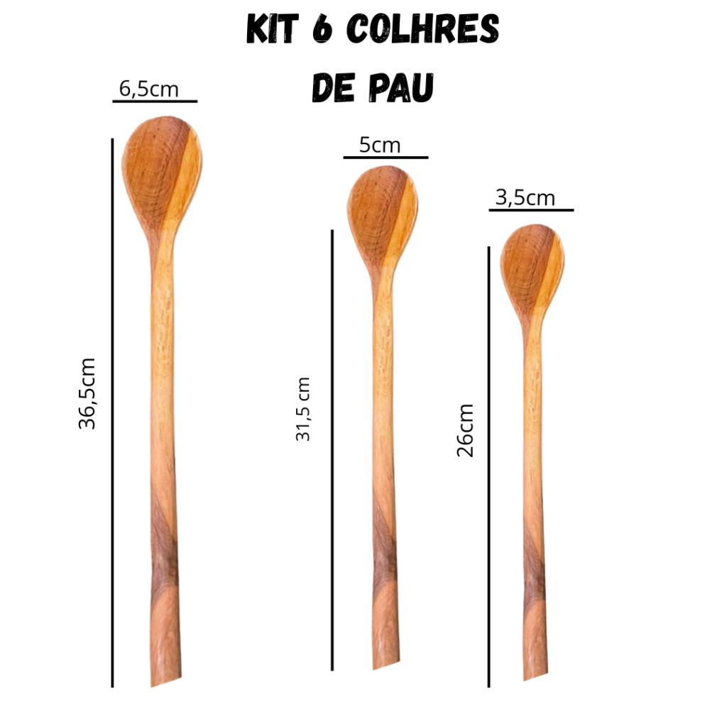 Colher de Pau Kit com 6 Madeira Natural Tamanhos PP P M Utensílio Cozinha Artesanal Durável