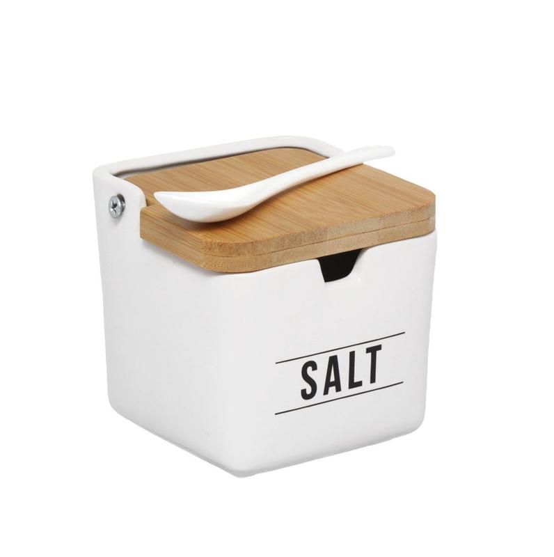 Saleiro Branco Manhattan Porcelana Ceramica Com Colher e Tampa de Bambu Haukraft Cozinha Salt Mesa