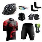 Kit Conjunto Ciclismo Camisa e Bermuda + Capacete de Ciclismo C/ Luz LED + Luvas de Ciclismo + Óculos Esportivo + Par de Manguitos + Bandana