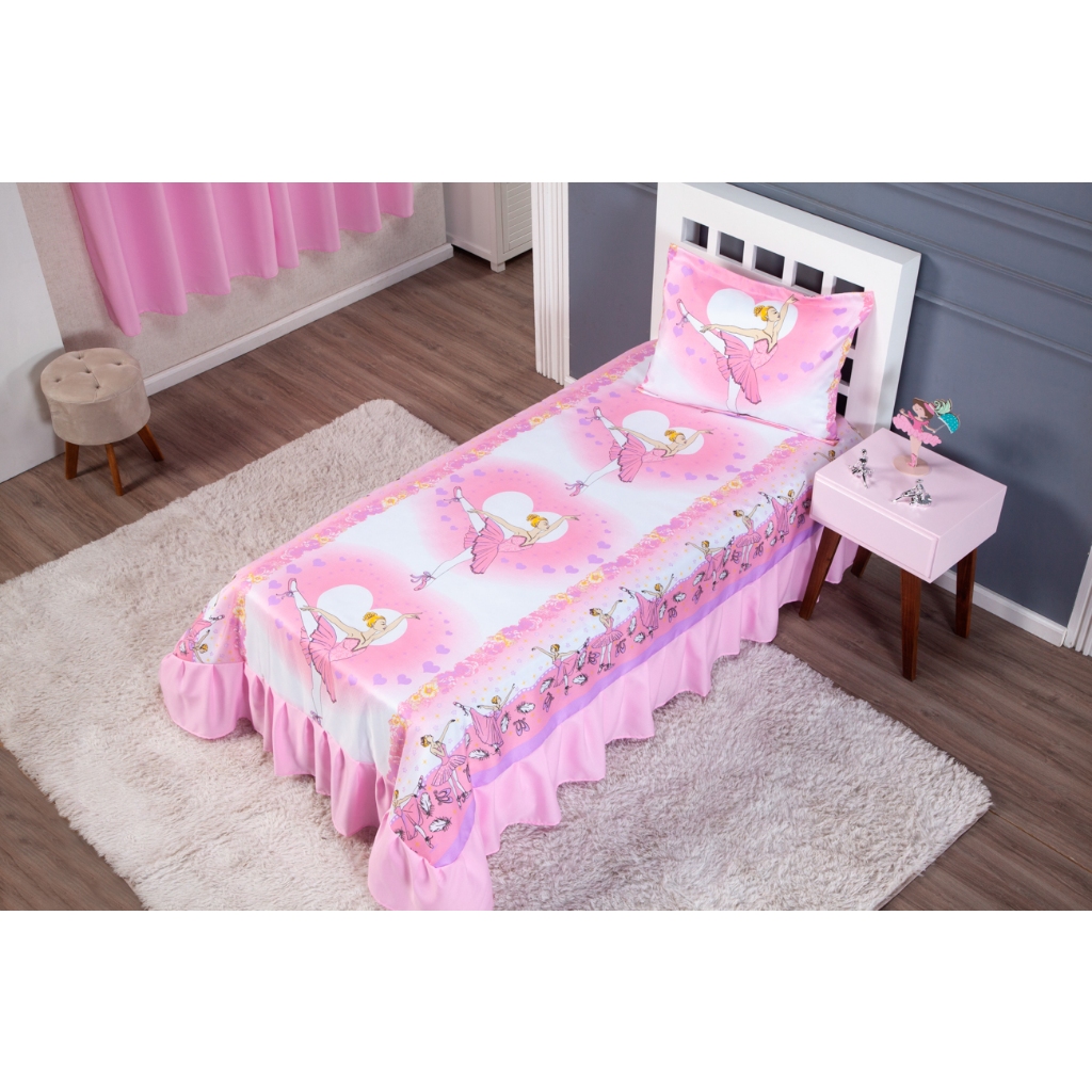Kit Colcha Cobre Leito Solteiro Chiquitita Infantil Quarto Criança Rosa Lilás 06 Peças com Cortina