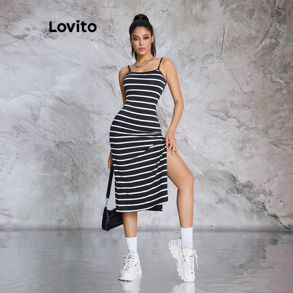Lovito Vestido Básico Casual Listrado Com Frente Dividida Para Mulheres LBE02098 (Preto)