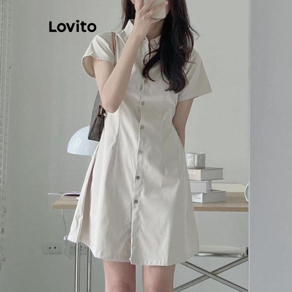 Lovito Vestido Básico Casual Com Botão Liso Na Frente Para Mulheres LNE33084 (Cáqui/Esbranquiçado)