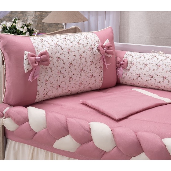 Kit Berço Trança Menina Completo Padrão Nacional E Americano 9 Peças Modelo Tranca Rosê Floral Rosa Pink Neutro Nuvem Amor Protetor Rolinho Lateral Berço para bebê Enxoval para berço - Promoção