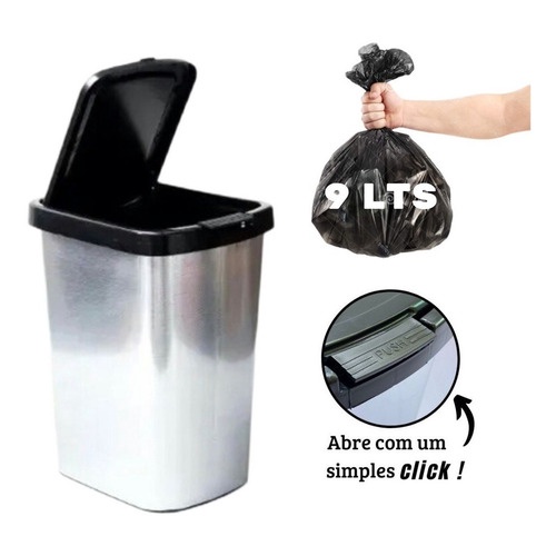 Lixeira Cesto Tipo Inox Com Tampa Click 9 Litros Label Retangular Plástico Automatica Prata Banheiro Pia Cozinha Quarto Escritório Lixo 9l Metalizado Plástica Promoção