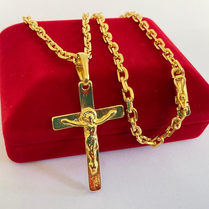 Corrente Cordão Moeda Antiga Banhado a Ouro 18k 3,5 mm/ 70 Cm+ Pingente Crucifixo (1 ano de garantia)