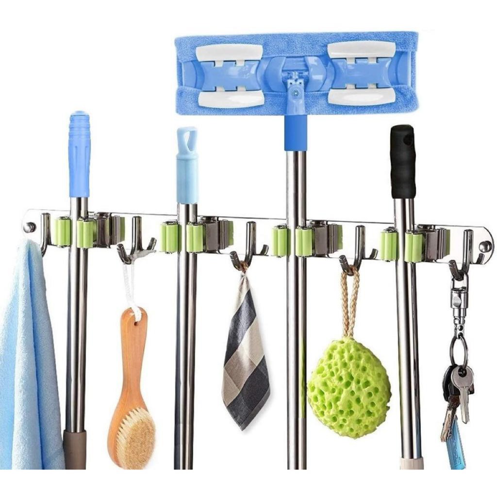 Porta Vassoura Rodo Suporte de parede Com Encaixes e Ganchos Multiuso aço inox reforçado 9 posições