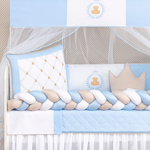 Kit Berço Ursinho Azul Bebe Americano Trança Completo Com Ninho Redutor Premium 15 Peças